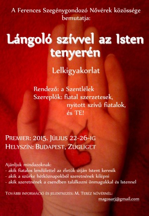 A Ferences Szegénygondozó Nővérek Közösség fiatal tagjai ötnapos lelkigyakorlatra hívnak július 22. és 26. között húszas-harmincas éveikben lévő fiatalokat, akik keresik aki az Istennel való személyes kapcsolat lehetőségeit, illetve az életükben lévő döntésekben szeretnének segítséget kapni.