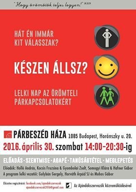 „Hogy örömötök teljes legyen!” (Jn 16,24) mottóval rendeznek lelkinapot az Ajándékszervezők közreműködésével az örömteli párkapcsolatokért április 30-án, szombaton 14 órától 20.30-ig a budapesti Párbeszéd Házában (1085 Budapest, Horánszky u. 20.).