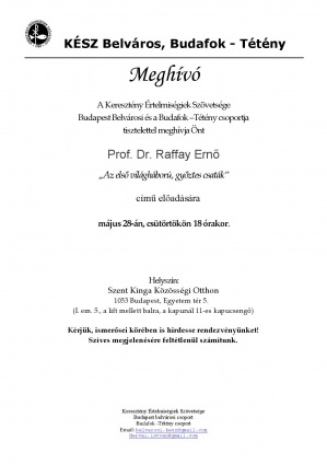 A Keresztény Értelmiségiek Szövetsége (KÉSZ) Budapest belvárosi csoportja meghívására május 28-án, csütörtökön 18 órakor Prof. Dr. Raffay Ernő Az első világháború, győztes csaták címmel tart előadást.