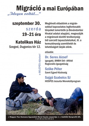 Migráció a mai Európában – „Idegen voltál …” címmel rendez fórumbeszélgetést a Morel Gyula Kör, a Magyar Pax Romana szegedi szervezete szeptember 30-án, szerdán 19.00 és 21.00 óra között Szegeden a Katolikus Házban (Dugonics tér 12.).