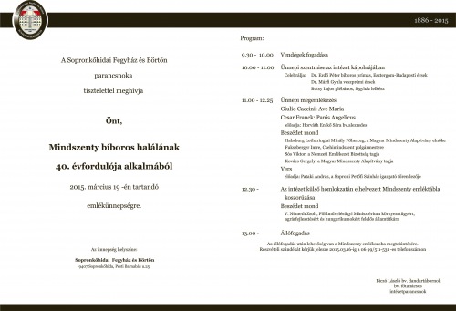 Március 19-én ünnepi megemlékezést tartanak Mindszenty bíboros halálának 40. évfordulója alkalmából a Sopronkőhidai Fegyház és Börtönben (Pesti Barnabás u. 25.)