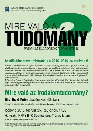 A Mire való a tudomány 2015–2016-os tanévbeli lőadássorozata keretében Dávidházi Péter akadémikus tart előadást Mire való az irodalomtudomány? címmel február 25-én, csütörtökön 17 órakor.