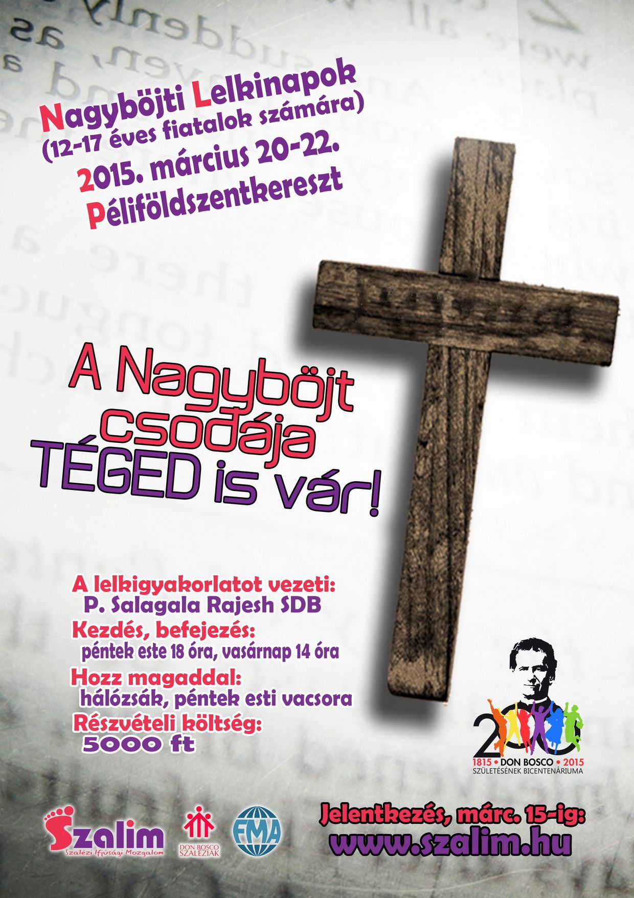 Nagyböjti lelki napokat tartanak Péliföldszentkereszten serdülőknek március 20. és 22. között (pénteken 18 órától vasárnap 14 óráig) a Don Bosco Szaléziak, a Segítő Szűz Mária Leányai és a Szalézi Ifjúsági Mozgalom közös szervezésében.