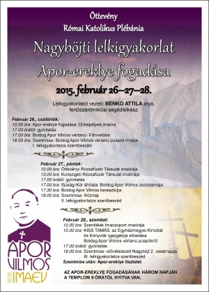 Boldog Apor Vilmos ereklyéjének fogadásával egybekötött nagyböjti lelkigyakorlatot tartanak az öttevényi plébánián február 26. és 29. között (csütörtöktől szombatig).