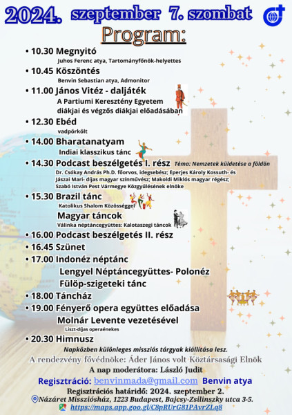 Regisztrálni lehet és további információ kérhető a benvinmada@gmail.com e-mail-címen Benvin Sebastian SVD atyától.