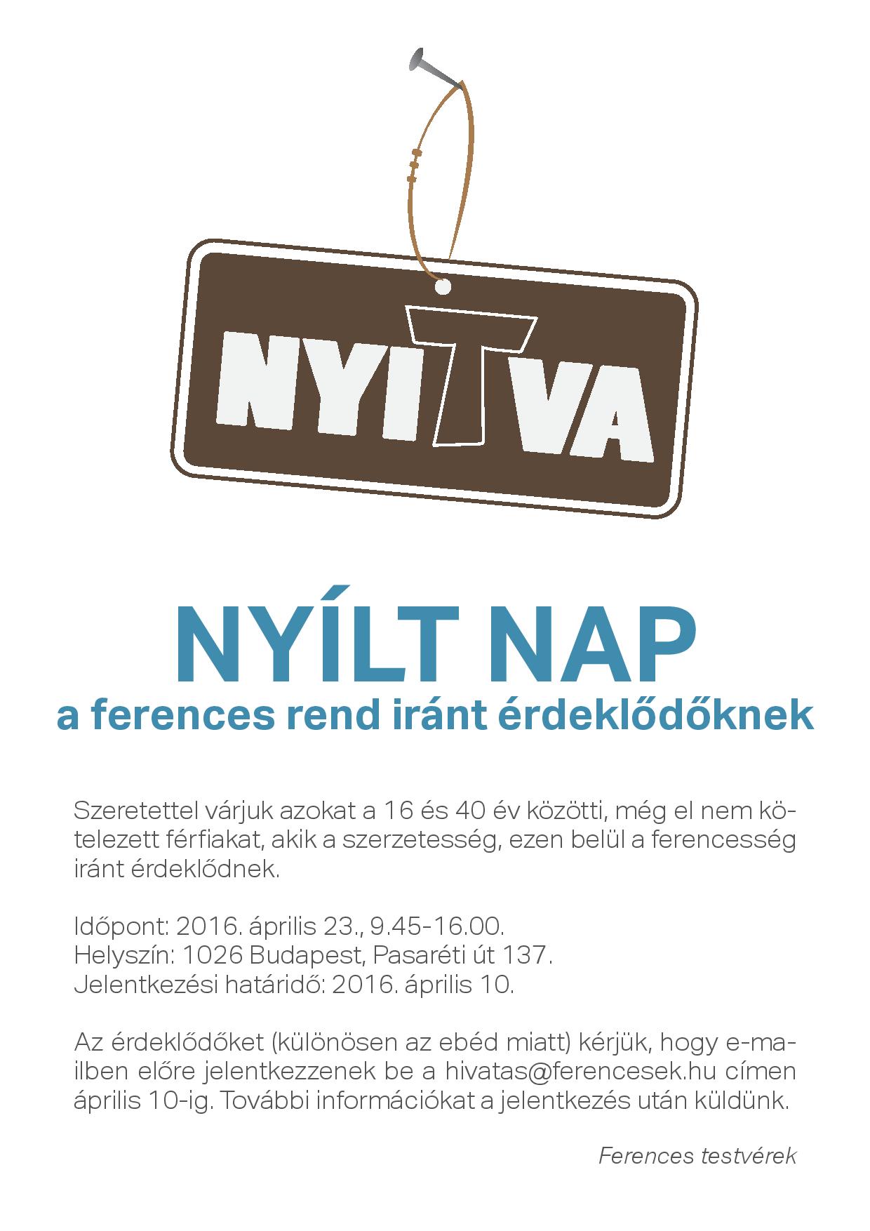 Nyílt napot tartanak a ferencesek április 23-án 9.45-től 16 óráig a pasaréti rendházban (Budapest, Pasaréti út 137.) a szerzetesség, ezen belül a ferencesség iránt érdeklődő 16 és 40 év közötti, még el nem kötelezett férfiaknak.