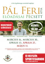 Április 27-én, hétfőn folytatódik Pál Ferenc atya öt előadásból álló sorozata Pécsett. A nagy érdeklődésre tekintettel a Lauber Dezső Sportcsarnokban 18.30-kor kezdődik a negyedik előadás.