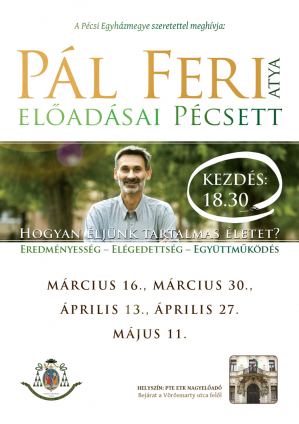 Pál Ferenc atya öt előadásból álló sorozatot tart Pécsett eredményességről, együttműködésről és elégedettségről. Az előadások során azt vitatják majd meg a résztvevők, hogyan lehet eredményesen, gyümölcsözően élni úgy, hogy a siker ne csak az egyén sikere legyen, hanem a másik ember javát is szolgálja, s az egyéni karrier pozitívan hasson a többi emberre is. Mindezek elérése után pedig az marad, hogy ne csak az eredményességnek és az együttműködésnek tudjunk örülni, hanem jól tudjuk kezelni az esetleges kudarcot is. Pál Ferenc atya előadásai tehát választ adnak a kérdésre: hogyan legyünk elégedettek?