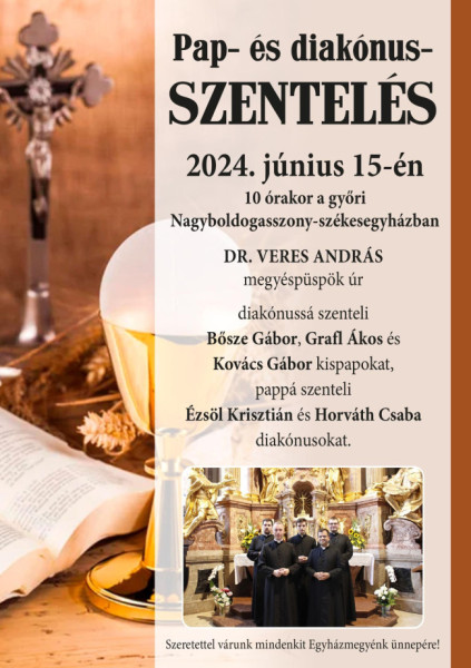 Az ünnepi szentmisében Veres András megyéspüspök diakónussá szenteli Bősze Gábor, Grafl Ákos és Kovács Gábor kispapokat, és pappá szenteli Ézsöl Krisztián és Horváth Csaba diakónusokat.