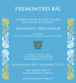 Premontrei bált rendeznek a Gödöllői Királyi Kastély lovardájában január 30-án 18 órától. A bál bevételével a Premontrei Szent Norbert Gimnázium, Egyházzenei Szakközépiskola és Diákotthont támogatják.További információk a bál honlapján találhatók.