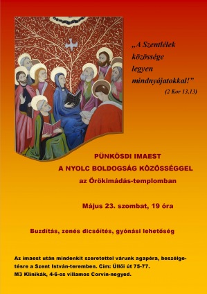 A Nyolc Boldogság Közösség szeretettel vár mindenkit pünkösdi dicsőítő imaestre május 23-án, szombaton 19 órakor az Örökimádás-templomban.Helyszín: 1094 Budapest, Üllői út 75–77. (Klinikák metrómegálló vagy 4-es 6-os villamos Corvin-köz).