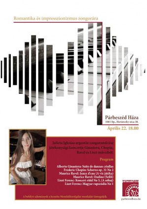 Április 22-én, pénteken, 18 órától Romantika és impresszionizmus zongorára: Julieta Iglesias argentin zongoraművész jótékonysági koncertje Ginastera, Chopin, Ravel és Liszt műveiből.