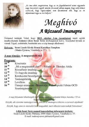 Hetedik alkalommal rendezik meg a Rózsaeső-imanapot – Kis Szent Teréz napot – október 3-án, szombaton 10 és 18 óra között a Makó-Újvárosi Szent László király-templomban (Makó, Vásárhelyi u. 57.).