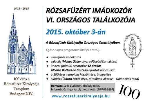 Rózsafüzért Imádkozók VI. Országos Találkozóját tartják október 3-án, szombaton 9 órától a budapesti Rózsafüzér Királynéja-templomban, amely napon a templom felszentelésének 100. évfordulóját is ünneplik.
