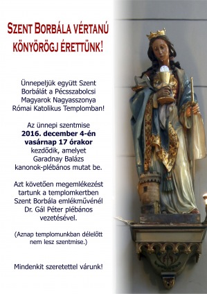 Ünnepi szentmisével emlékeznek meg a vértanú Szent Borbáláról Pécsszabolcson a Magyarok Nagyasszonya-templomban.