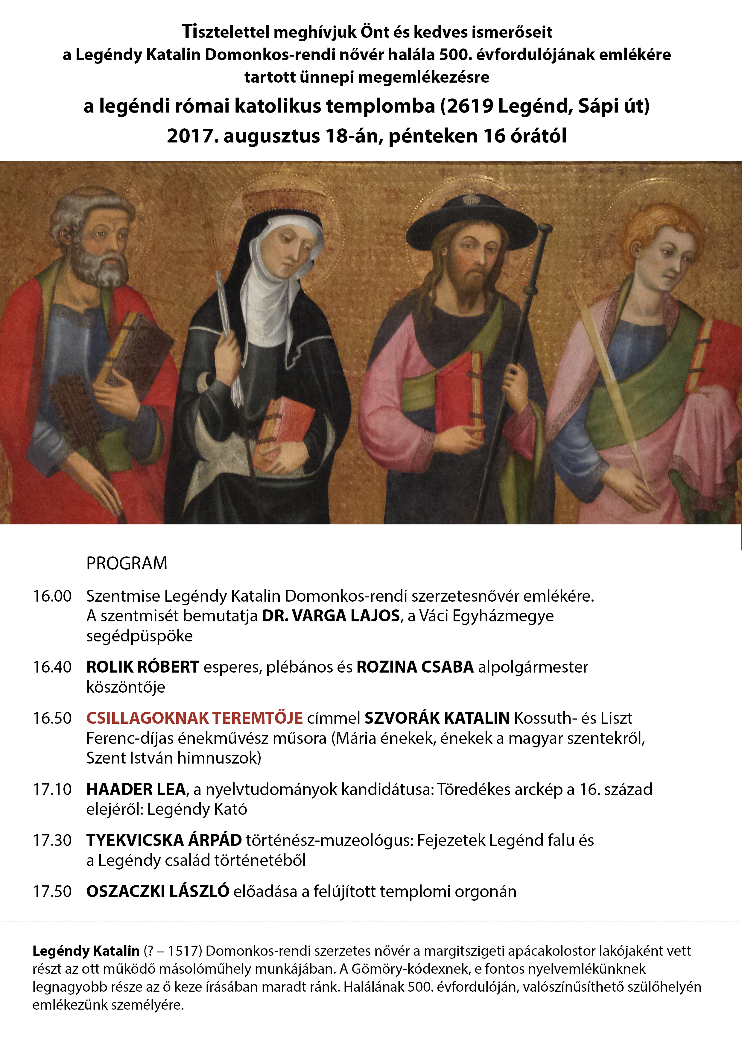 Program: 16:00 Szentmise Legéndy Katalin domonkos-rendi szerzetesnővér emlékére, melyet Dr. Varga Lajos váci segédpüspök mutat be