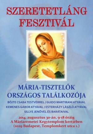Augusztus 30-án, szombaton 9 és 18 óra között rendezik meg a Mária-tisztelők első országos találkozóját, a Szeretetláng fesztivált a máriaremetei kegytemplom parkjában (1029 Budapest, Templomkert utca 1.).