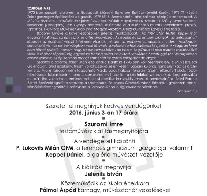Program: Szuromi Imre festőművész kiállításmegnyitója, melyet Jelenits István atya nyit meg.