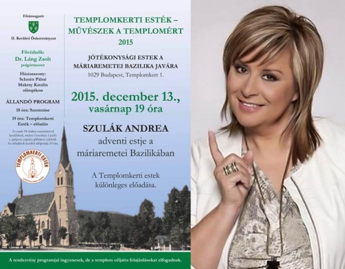Az idei Templomkerti Esték záró rendezvényeként 2015. december 13-án, vasárnap 19 órakor Szulák Andrea előadóművész tart jótékonysági adventi koncertet a Máriaremetei Bazilikában (1029 Budapest, Templomkert 1.), a templom javára.
