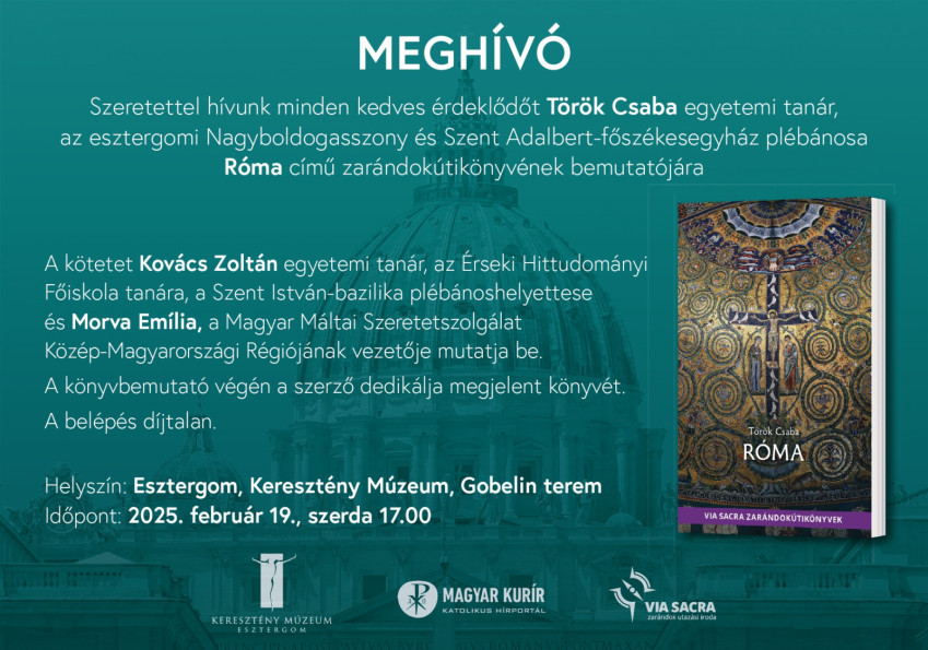 Szeretettel hívunk minden kedves érdeklődőt Török Csaba egyetemi tanár, az esztergomi Bazilika plébánosa Róma című zarándokútikönyvének bemutatójára, a Keresztény Múzeum Gobelin termébe.