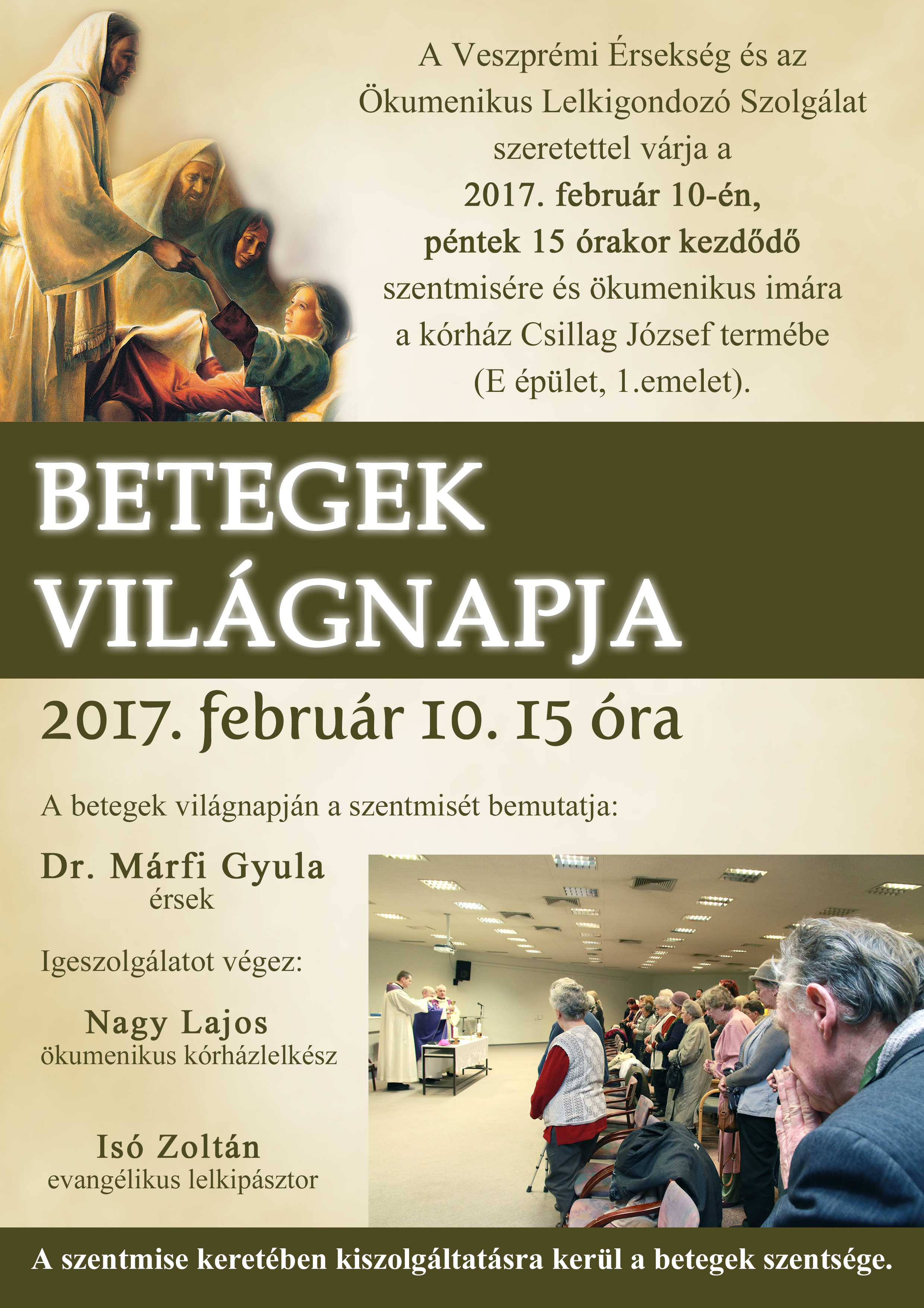 A Veszprémi Érsekség és az Ökumenikus Lelkigondozói Szolgálat szeretettel vár mindenkit a betegek világnapja alkalmából a 2017. február 10-én, pénteken 15 órakor kezdődő szentmisére és ökumenikus imaórára a veszprémi kórház Csillag József termébe (E ép. 1. em.).