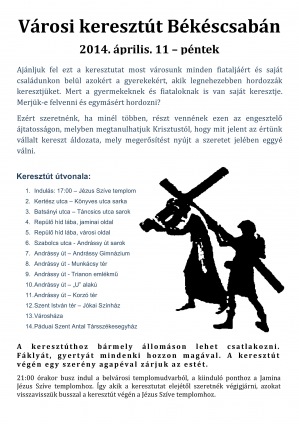 Április 11-én, pénteken 17 órakor engesztelő városi keresztútra várják a Zenebarát–Felebarátok a híveket Békéscsabán. A keresztutat a város fiataljaiért és a családokon belül azokért a gyerekekért ajánlják fel, akik legnehezebben hordozzák keresztjüket.