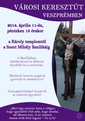 Április 11-én, pénteken 18 órakor városi keresztút-járásra várják a híveket Veszprémben, a Károly-templomtól (Mártírok útja) a Szent Mihály-bazilikáig (Vár u. 27.). A bazilikában elmélkedéssel és áldással fejeződik be a szertartás. A keresztúton Márfi Gyula veszprémi érsek is részt vesz.