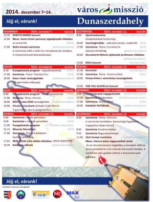 December 7. és 14. között rendezik meg Dunaszerdahelyen első ízben a Városmisszió 2014 lelkigyakorlatok hetét, amelyen több beszéd és prédikáció hangzik majd el arról, hogyan éljünk teljes emberi és keresztény életet.