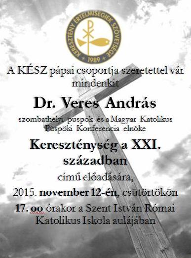 2015. november 12-én 17 órakor dr. Veres András szombathelyi püspök, a Magyar Katolikus Püspöki Konferencia elnöke Kereszténység a XXI. században címmel tart előadást a pápai KÉSz csoport meghívására a Szent István-iskola aulájában.