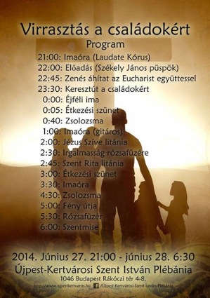 A június 27-ről 28-ra virradó éjszakán a családokért imádkoznak. A virrasztás elmélkedését Székely János püspök tartja.