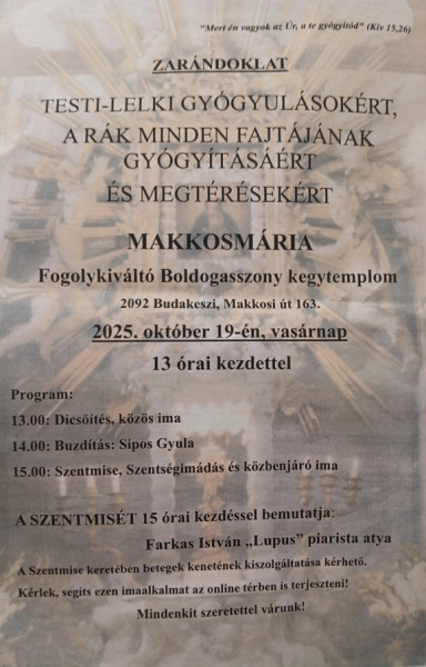 Zarándoklat megtérésekért, testi, lelki gyógyulásokért és azért, hogy a daganatos