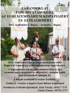 Szeptember 6-án, vasárnap gyalogos zarándoklat indul Bogácsról Szomolyára, a Kisboldogasszony-napi búcsúra.