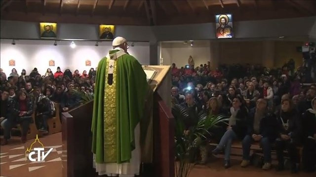A legnagyobb létszámú csoport, mely Ferenc pápára várt, a hittanosok közössége volt, köztük a bérmálás utáni haladó csoporttal, akikhez szólva püspökük, Ferenc pápa hangsúlyozta a család alapvető szerepét a hit átadásában. A cserkészek köszöntése után a szentatya örömmel állapította meg, hogy több mint százan vannak azok a plébániai önkéntesek, akik plébánosuk és beteg káplánjuk munkáját segítik, illetve pótolják. Velük beszélgetve a pápa a misszió fontosságát hangsúlyozta, méghozzá egészen konkrét lelkipásztori tanácsokkal. A szentatya köszöntötte az összegyűlt papságot és a plébánia öt szeminarista kispapját, majd a sekrestyében gyóntatott néhány hívőt. Igazi lelkipásztori látogatás volt ez a pár óra, melyet végül a szentmise koronázott meg az évközi időszak második vasárnapján. A szentmise után a búcsúzó pápát a templom előtt ezrek várták, akik kivetítőkön követték a szertartást.