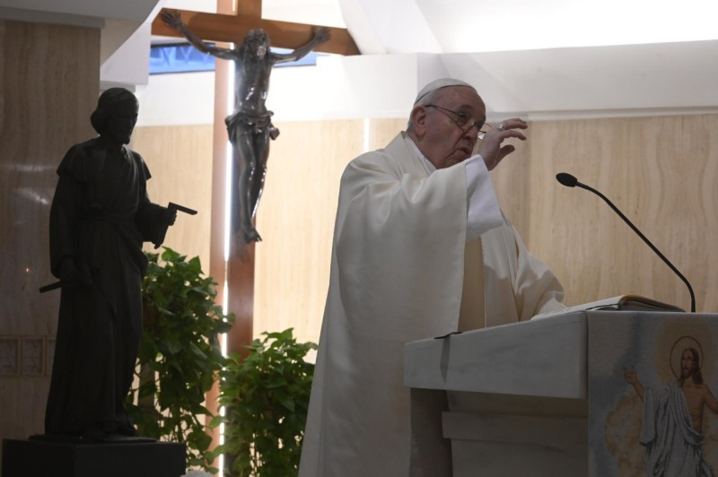 Homíliájában Ferenc pápa a napi olvasmányokat kommentálta. Az apostolok cselekedetének részlete (ApCsel 9, 31–42) azt mutatja be, hogy miként szilárdult meg az első keresztény közösség és a Szentlélek vigasztalásával számban gyarapodott. Két eseményről számol be, amelyeknek Péter áll a középpontjában: az egyik a béna meggyógyítása Liddában, a másik egy asszony, Tabita feltámasztása. Ez a béke időszaka. Az Egyház nyugodt, szép időket él, a vigasz pillanataiban növekszik.