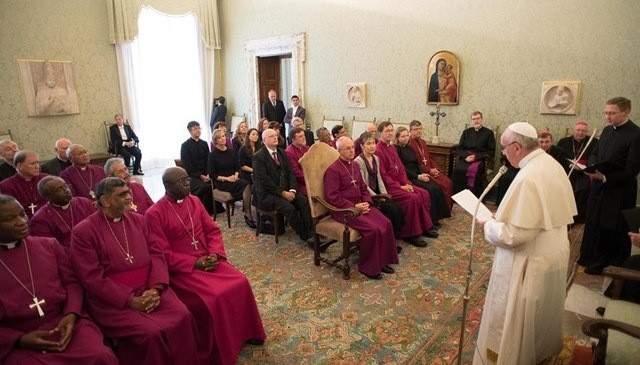 „Kedves Fivéreim és Nővéreim Krisztusban – szólította meg őket rövid beszédében a pápa –, nagy öröm számomra látni számos anglikán provincia prímását abból az alkalomból, hogy megemlékeztünk a Boldog VI. Pál pápa és Michael Ramsey anglikán prímás között ötven évvel ezelőtt létrejött történelmi találkozóról. Sok gyümölcsöt termett ez a találkozó, elég csak a római Anglikán Központ létrejöttére, a szentszéki állandó anglikán képviselő kinevezésére vagy a teológiai párbeszéd kezdetére gondolni. Ezek az eredmények mind az ötven évvel ezelőtt ültetett fa gyümölcsei.”