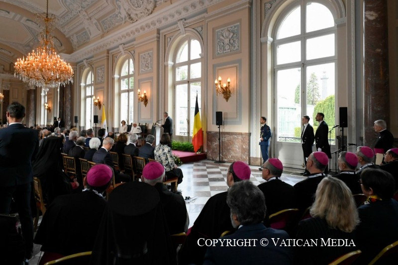 Sajátos történelme révén Belgium fontos szerepet játszik a kontinens egyensúlyában, a második világháborút követően az európai nemzetek ugyanis a béke, az együttműködés és az integráció útjára lépve ezt az országot választották a főbb európai intézmények székhelyéül, a földrész fizikai, erkölcsi és spirituális újjáépítésére. Úgy is fogalmazhatunk, hogy Belgium földrajzi és kulturális értelemben híd észak és dél, a germán és a latin világ között. A találkozás, a párbeszéd helye, ahol megtanuljuk, hogy saját identitásunkat ne bálványozzuk és ne tekintsük korlátnak, hanem egy befogadó térnek lássuk, amelyből kiindulva új szintézisekre törekszünk. Ez a híd elengedhetetlen ahhoz, hogy a békét építsük és elutasítsuk a háborút – hangsúlyozta a pápa.