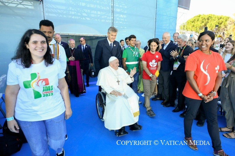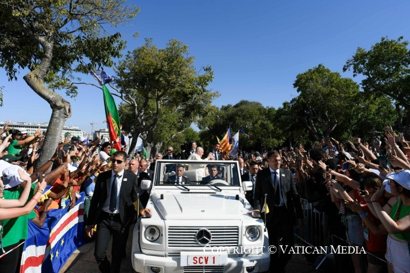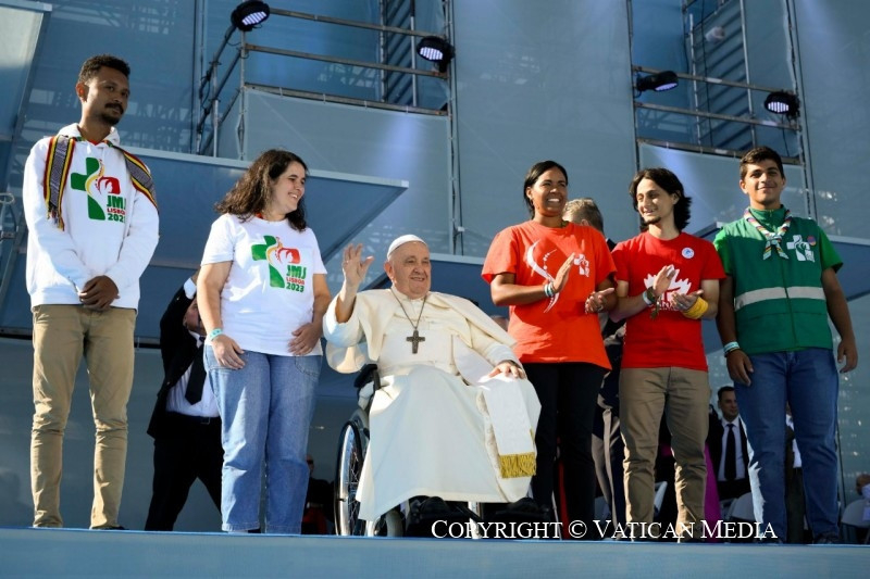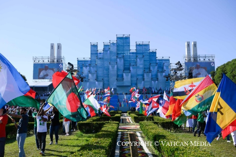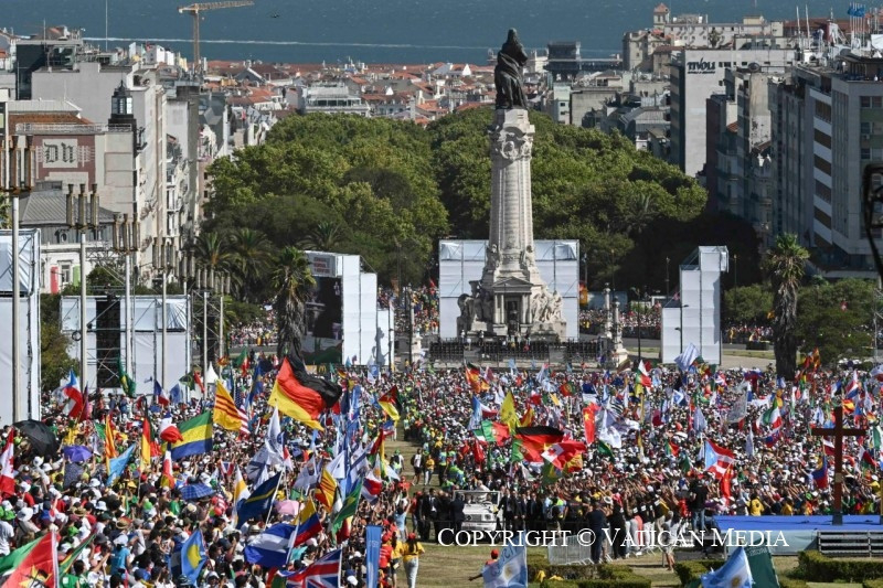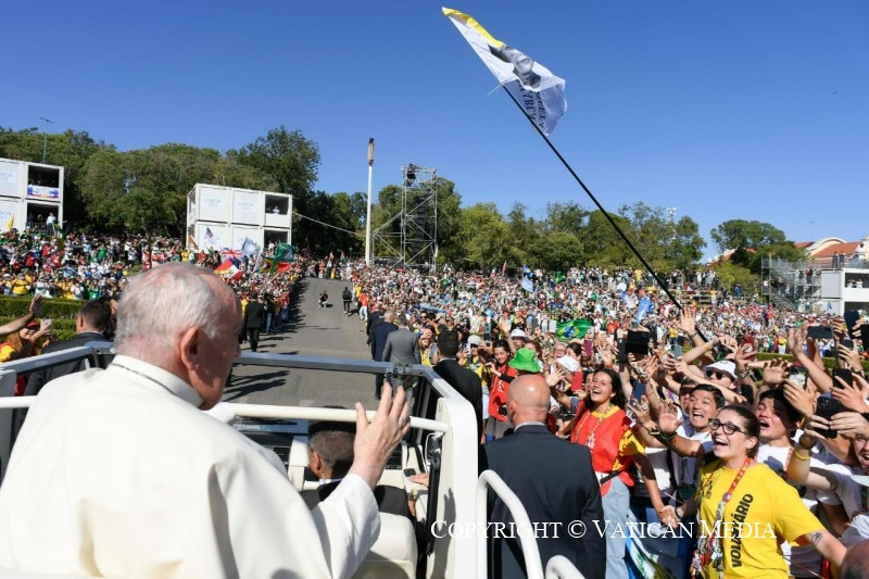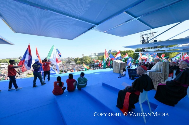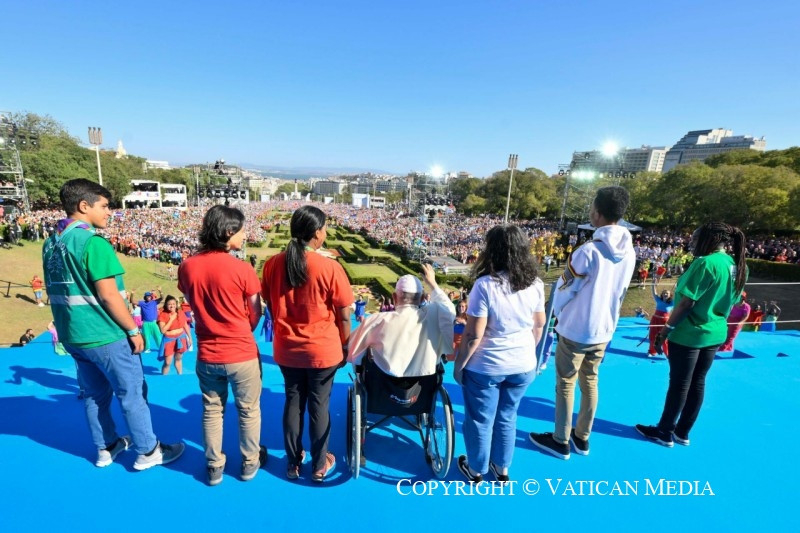 Üdvözöllek benneteket! Üdvözöllek benneteket, és köszönöm, hogy itt lehetek. Boldog vagyok, hogy látlak titeket! Örömmel hallgatom a vidám zsivajt, amit csaptok; megfertőz örömötök. Jó együtt lenni Lisszabonban. Én hívtalak ide benneteket, valamint a pátriárka – akinek köszönöm a szavait –, püspökeitek, papjaitok, katekétáitok és ifjúsági vezetőitek. Mondjunk köszönetet mindazoknak, akik meghívtak titeket, és mindazoknak, akik azon dolgoztak, hogy lehetővé váljon ez a találkozó – és ezt hangos tapssal köszönjük meg! Mindenekelőtt azonban Jézus hívott meg benneteket. Mondjunk köszönetet Jézusnak egy újabb hangos tapssal!