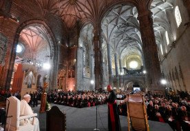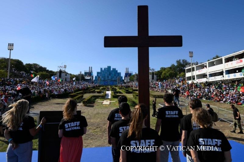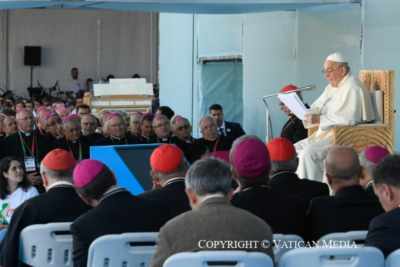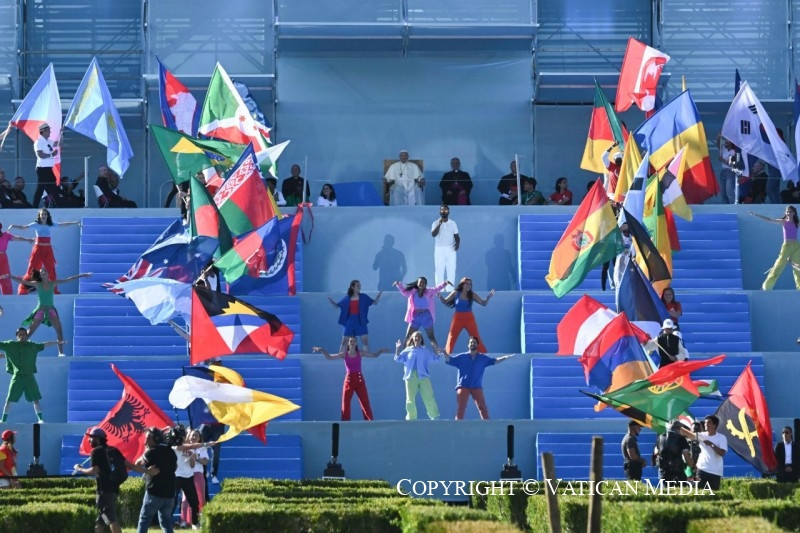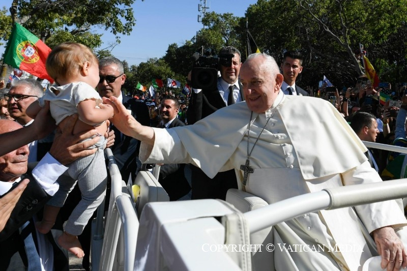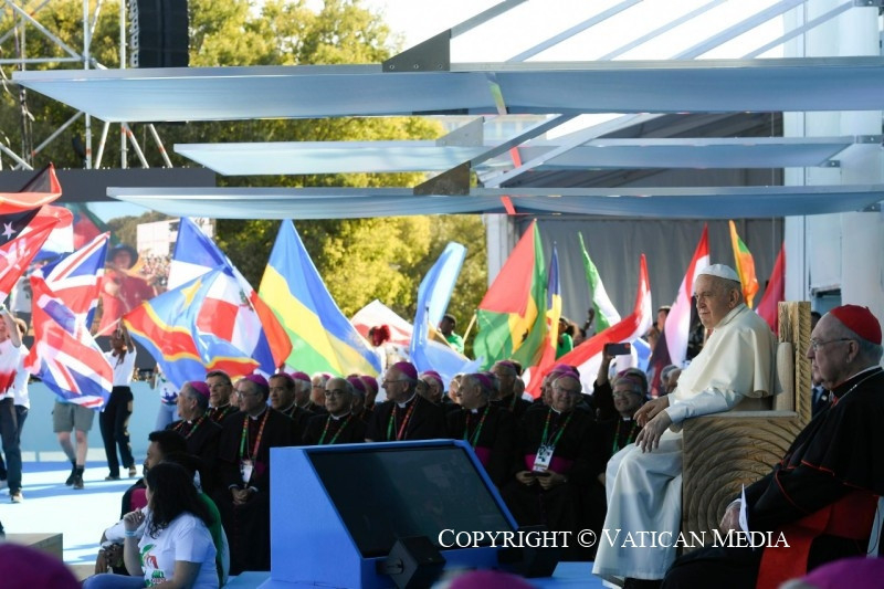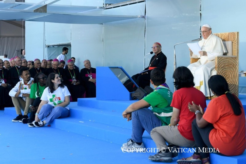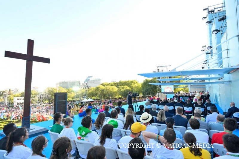 Üdvözöllek benneteket! Üdvözöllek benneteket, és köszönöm, hogy itt lehetek. Boldog vagyok, hogy látlak titeket! Örömmel hallgatom a vidám zsivajt, amit csaptok; megfertőz örömötök. Jó együtt lenni Lisszabonban. Én hívtalak ide benneteket, valamint a pátriárka – akinek köszönöm a szavait –, püspökeitek, papjaitok, katekétáitok és ifjúsági vezetőitek. Mondjunk köszönetet mindazoknak, akik meghívtak titeket, és mindazoknak, akik azon dolgoztak, hogy lehetővé váljon ez a találkozó – és ezt hangos tapssal köszönjük meg! Mindenekelőtt azonban Jézus hívott meg benneteket. Mondjunk köszönetet Jézusnak egy újabb hangos tapssal!