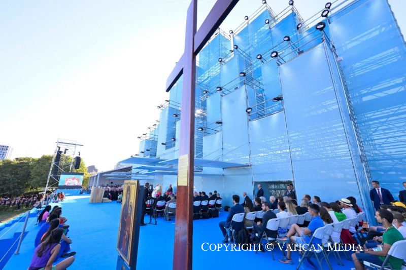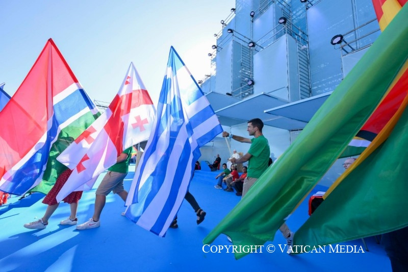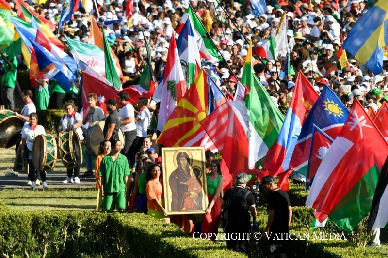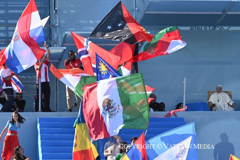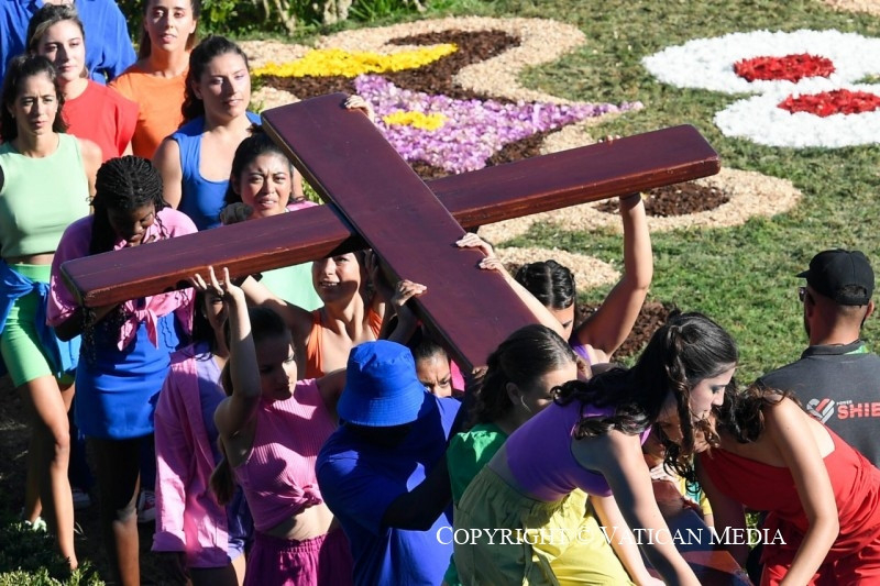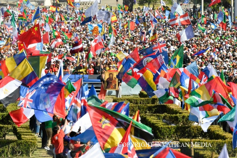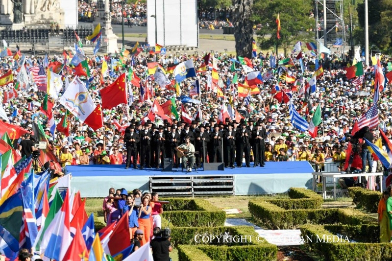 Kedves fiatalok, ezen az ifjúsági világtalálkozón segítsünk egymásnak felismerni ezt a valóságot. Legyenek ezek a napok Isten szeretetre hívásának lelkesedéssel lüktető visszhangjai, mert Isten szemében értékesek vagyunk, annak ellenére, hogy olykor a szemünket elhomályosítja a negativitás és elkápráztatja sok zavaró tényező. Legyenek ezek olyan napok, amikor az én nevem és a ti nevetek, amelyet sok nyelv és nemzet testvérei barátsággal mondanak ki – oly sok zászlót látunk! – úgy hangozzék, mint egyedülálló hír a történelemben – mert egyedülálló. Isten szíve mindegyikőtökért egyedülállóan dobog.