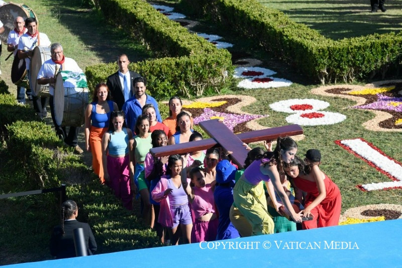 Kedves fiúk és lányok, gondolkodjatok el ezen a nagyon szép dolgon: Isten szeret minket, Isten úgy szeret minket, amilyenek vagyunk, nem úgy, amilyenek szeretnénk lenni, vagy ahogy a társadalom szeretné, hogy legyünk. Úgy szeret minket, amilyenek vagyunk – a hibáinkkal, a korlátainkkal és azzal a vággyal együtt, hogy előrehaladjunk az életben. Isten így hív minket. Bízzatok, mert Isten Atya. Olyan Atya, aki szeret minket. Atya, aki jót akar nekünk. Ez nem túl könnyű, és ehhez nagy segítséget kapunk az Úr Anyjában, aki a mi Anyánk is. Ő a mi Anyánk. Csak ezt akartam elmondani nektek.