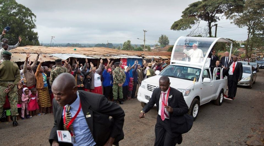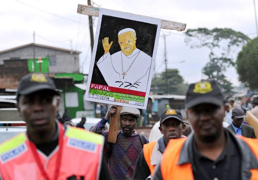 A pápa autójával végigment a földutakon a Munkás Szent Józsefről elnevezett katolikus plébániáig. A Kangemi nevű negyedben a templomot a jezsuiták tartják fenn, akik több szolgáltatással is jelen vannak a barakkvárosban: orvosi rendelőt, szakmunkásképző iskolát működtetnek és egy olyan központot, ahol nehéz helyzetbe került édesanyák kapnak menedéket. Miután meghallgatta vendéglátóinak, köztük egy helyi lakosnak a köszöntését, Ferenc pápa a plébániatemplomban beszélt az összegyűlt lakosokhoz. Beszédét az alábbiakban teljes terjedelmében közöljük.