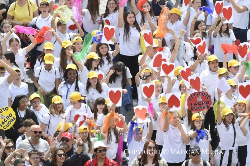 Szeretettel üdvözöllek mindnyájatokat, rómaiak, Olaszországból és sok más országból érkezett zarándokok. Számos ország zászlaját látom. Külön is köszöntöm a salamancaiakat és az albacetei diákokat, valamint a Máltai Lovagrend Segélyszervezetének veneto-trentinói csoportját. Üdvözlöm Ferrara, Palermo és Grumello del Monte híveit; a lodi egyházmegyei iskola közösségét; az albai, bergamói, bresciai, comói és milánói egyházmegye városainak fiataljait; számos olasz egyházközség bérmálkozóit; a cadoneghei Sacro Cuore Intézet diákjait; a casoli „Volœntieri” munkaközösséget és az agnai „Mototurismo” csoportot.