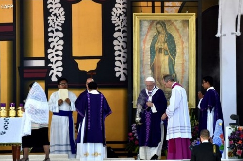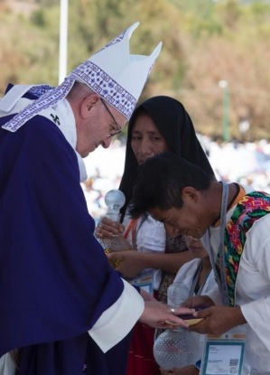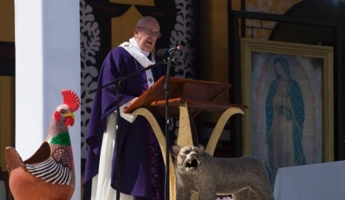 Ferenc pápa ebbe a kontextusba érkezett, hogy szentmisét mutasson be a San Cristóbal de las Casas-i stadionban. A szertartást három maja nyelven tartották: celtál, csol, cotzil nyelven.