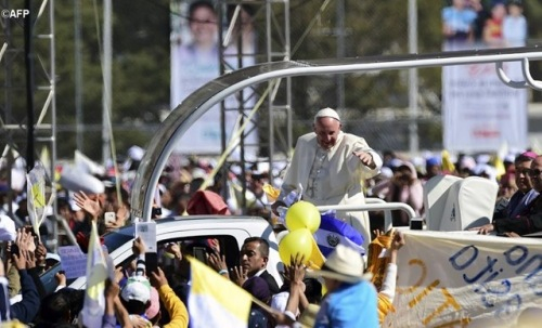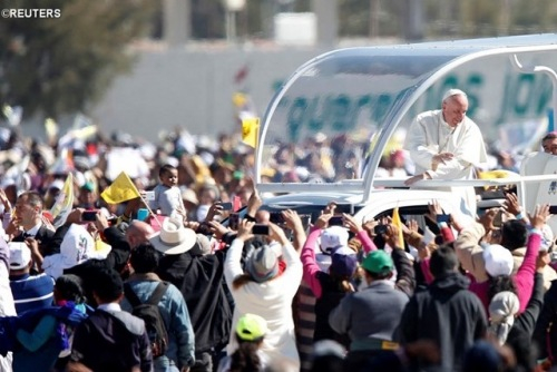 A tömeg folyamatos kiáltásokkal üdvözölte a Szentatyát érkezésekor: Üdvözlünk Ferenc pápa! Üdvözlünk az igazság pápája! Üdvözlünk a béke pápája! Üdvözlünk a szegények pápája!