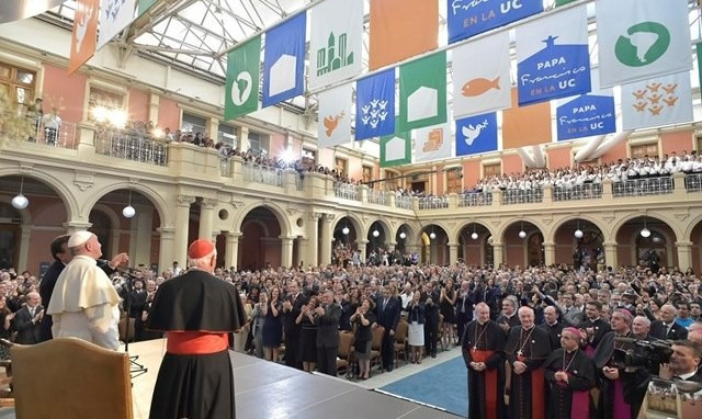 A Pápai Katolikus Egyetemet 1888-ban alapították a chilei főváros akkori érsekének kezdeményezésére. Ferenc pápa a 130 éves felsőfokú intézményben a jelen levő hétszáz hallgató és a chilei egyetemi világ ezerkétszáz képviselője előtt „átfogó írás- és olvasásoktatásra” buzdított.