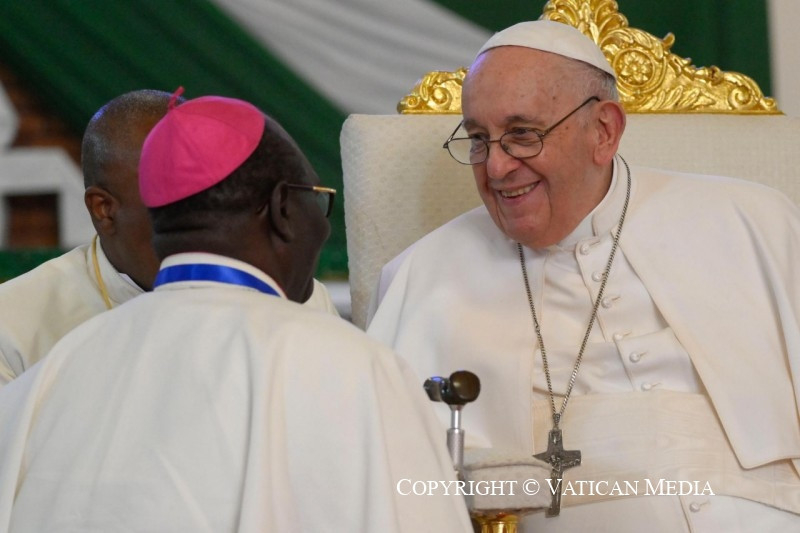 Hosszú ideje élt bennem a vágy, hogy találkozzam veletek; ezért ma szeretnék hálát adni az Úrnak. Hálás vagyok Tombe Trille érsek úrnak a köszöntésért, és mindnyájatoknak a jelenlétetekért és az üdvözlésetekért. Némelyek napokat utaztak, hogy ma itt lehessenek! Mindig szívemben hordozok néhány pillanatot, amelyet e látogatás előtt éltem át: a 2017-ben a Szent Péter-bazilikában tartott misét, amelyen Istenhez könyörögtünk a béke ajándékáért; és a 2019-es lelki lelkigyakorlatot a politikai vezetőkkel, akiket azért hívtam meg, hogy az ima által a szívükbe zárják azt a szilárd elhatározást, hogy a megbékélésre és a testvériségre törekszenek az országban. Mindenekelőtt erre van szükségünk: befogadni Jézust, a mi békénket és reménységünket.