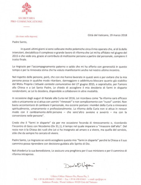 Viszont azon személyek iránti tiszteletből, akik együtt dolgoztak velem ezekben az években, és annak elkerülése érdekében, hogy személyem bármiképpen hátráltassa, károsítsa vagy egyenesen megállítsa azt, amit a 2015. június 27-én kelt, L’attuale contesto comunicativo [A mostani kommunikációs helyzet] kezdetű motu proprio lefektetett, és főleg az Egyház és az Ön iránti szeretetből, Szentatya, kérem, fogadja el azt a vágyamat, hogy félreálljak, ugyanakkor készségesen felajánljam, hogy – ha Ön kívánja – más formában folytassam az együttműködést.