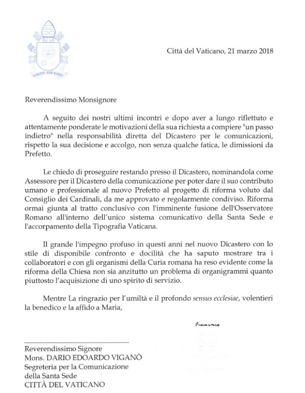 Főtisztelendő Atya, legutóbbi találkozásainkat követően, és miután hosszasan gondolkodtam, és alaposan mérlegeltem kérelmének indítékait, hogy „egy lépést hátralépjen” a kommunikációért felelős dikasztérium közvetlen vezetéséből, tiszteletben tartom döntését, és elfogadom – de nem könnyen – lemondását a prefektusi hivatalról.