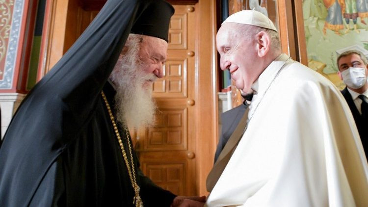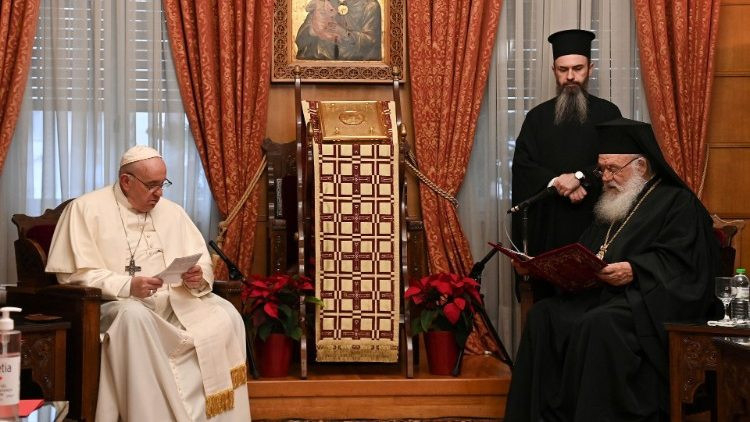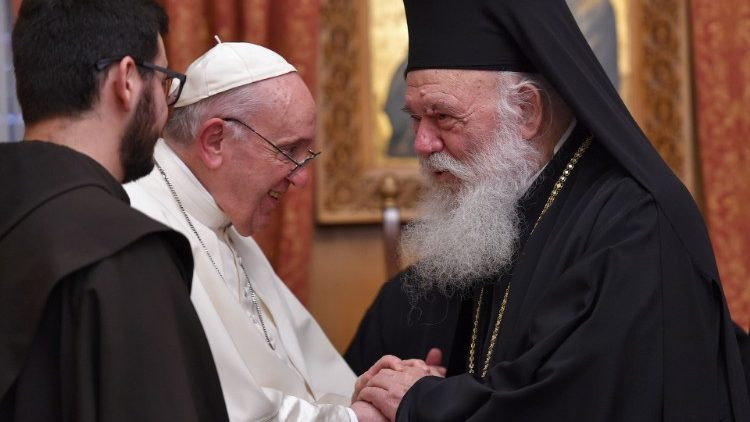 A privát találkozót követően az ortodox érsekség tróntermében fogadta Ferenc pápát és küldöttségét II. Jeromos ortodox érsek és kísérete. Az ortodox egyházi vezető testvéri érzéseiről biztosította a pápát, és Pál apostolt idézte, aki a közelben mondta jelentőségteljes szavait: „Amint szétnéztem és megtekintettem szentélyeiteket, ráakadtam egy oltárra, amelyen az a felírás állt: Az ismeretlen istennek. Nos, én azt hirdetem nektek, akit ti ismeretlenül tiszteltek” (ApCsel 17, 23).