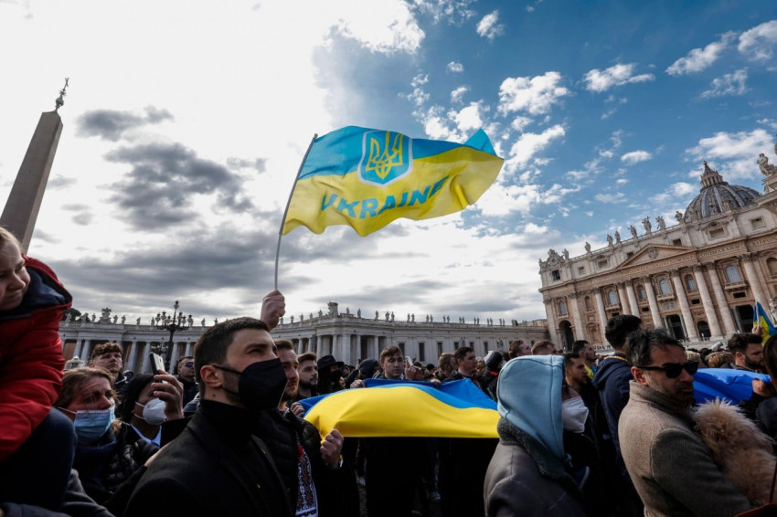 Imádkozzunk együtt Ukrajnáért! Itt vannak előttünk az ukrán zászlók. Imádkozzunk együtt, testvérekként, a Szűzanyához, Ukrajna Királynőjéhez! Üdvöz légy, Mária…